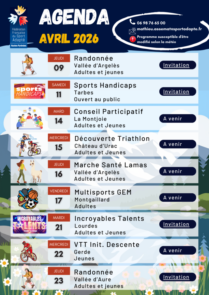 Découvrez sur cette page l’ensemble de nos actualités, newsletter et mises à jour au sujet d’événements à venir. RAPPORT AG DU 19 Février 2026 Nos dernières actus sur Instagram cdsa.65 🏔️ Sport adapté 📍 Hautes Pyrénées 🤸🏻♀️Un max d'activités 🚴🏼 Un max de fun 🤹🏼♀️ Un max de partage 📷⛰️Retour en images sur la rando de Jeudi dernier ⚽️🏅 Mercredi dernier notre équipe départementale a 🗓️📍 Planning mois de Mars du CDSA 65 Portrait du mois – Mars : Sernin 🤾🏼♂️ Ce mois-ci Charger plus Suivre sur Instagram La dernière Newsletter du CDSA 65 Cliquez ici